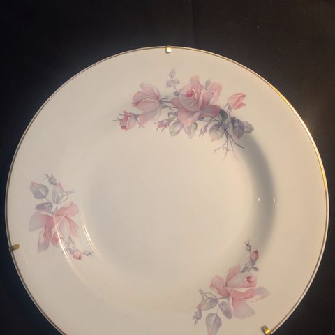 Vaaleanpunaiset ruusut, Diamant posliinia. Ilmeisesti II-laatua kun löytyy vain massaleimat. Mitään vikaa en kyllä näe, paitsi lievää kulumaa kullatuissa reunoissa.