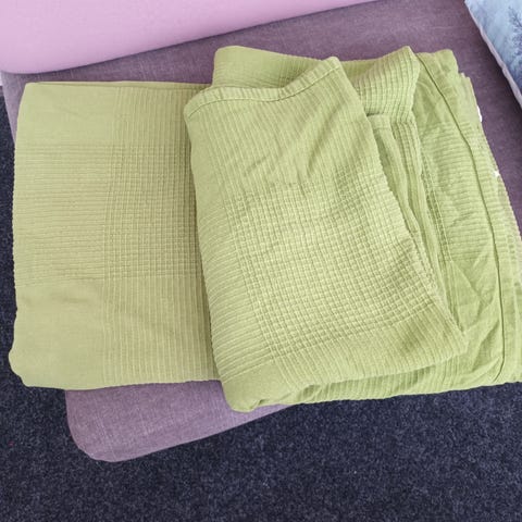 Ompelijalla Ikean vahvasta markiisikankaasta (100% puuvilla) teetetty söngynpeitto tai leikkipeitto lattialle. Takapuoli ruskeaa, normaalivahvuista puuvillakangasta (ei Ikean). Välissä on vanulevy, joka on siis tikattu ompeleilla reunoista ja myös keskellä on muutama kiinnityskohta ommeltuna, että vanu pysyy paikallaan (viim. kuva).