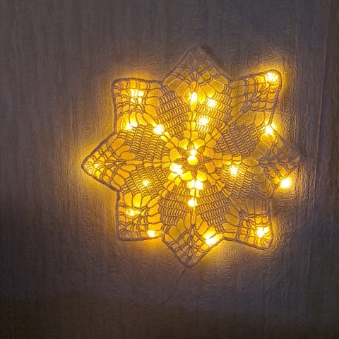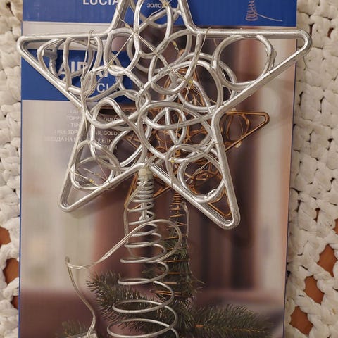 Myydään uusi joulukuusen hopeinen tähti, jossa valot.