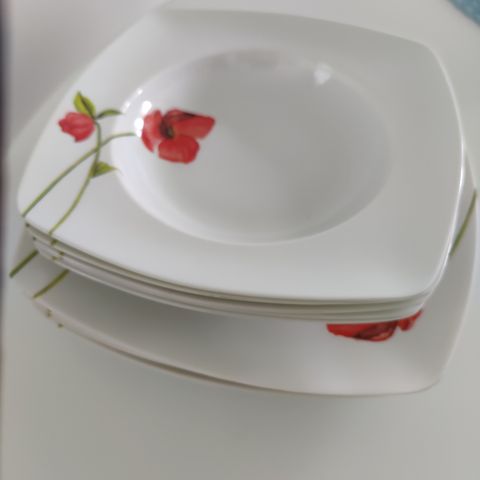 Uudet, käyttämättömät lautaset 6 kpl melamiinia, pieni säilytys naarmu tullut kahteen lautaseen, ei todellakaan haittaa tuossa kuosissa. kätevät esim. Mökille, ei hajoa helposti. Kestää konepesun.