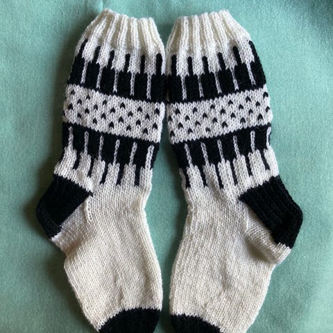 7 veljestä langasta käsin neulotut valkoiset sukat, koko 37. Kärjestä kantapäähän 23,5 cm, kantapohjasta varteen n. 29 cm.
