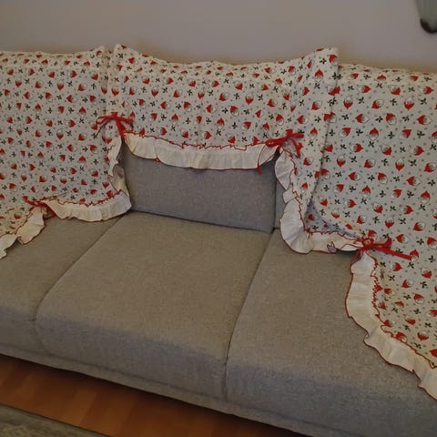 Vanhat, mutta lähes käyttämättömät puuvillaiset jouluverhot. Yläkapan pituus 240cm, leveys 55cm. Alareunassa rypytys. Alakappojen pituus 120cm, leveys 35cm. Kaikissa tankokuja.