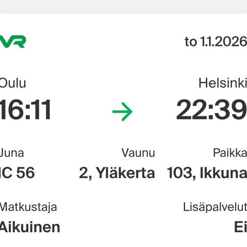 Matkoja sarjalipulta Oulu-Pasila-Masala. Kelpaa kumpaankin suuntaan. Viimeinen matkustuspäivä 9.2.