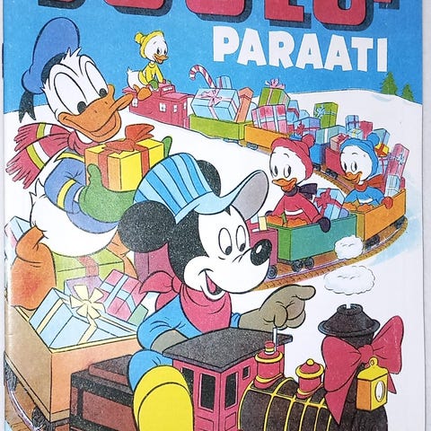 Aku Ankka ja eläinten jouluparaati kirja. Hyvässä kunnossa. Omistuskirjoitus ekalla sivulla, jonka peitän. Savuton ja eläimetön koti.