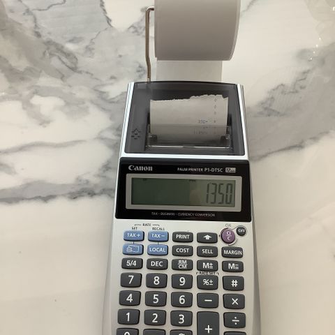 Nauhalaskin, Canon Canola P1421-0. Hyvässä kunnossa. Laskee moitteettomasti. Hyvä värinauha koneessa ja lähes täysi paperirulla. Mukana tietysti verkkojohto ja käyttöohje.