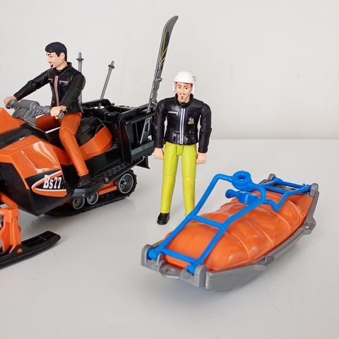 Saksalainen Bruder-merkkinen moottorikelkka + kuski. Kelkan toinen sivulaukku on kadonnut. Kuskilla tallella kypärä ja hanskat.