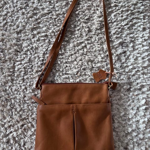 Täysin käyttämätön nahkainen olkalaukku, 32x28 cm. Kunnon vertoketjut, sisällä vetoketjullinen sisätasku ja pieni avotasku. Mukana säilytyspussi.