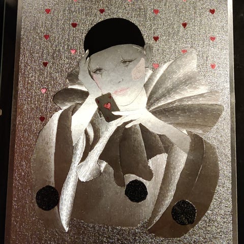 80-luvun metallihohtoinen Pierrot-taulu vaihtokehyksessä, koko 24x18