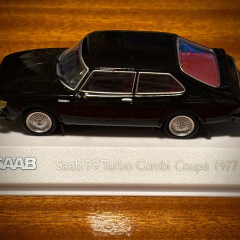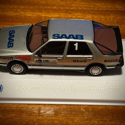 Saab 900i 1987 -pienoismalli, ruskean värinen, neljän oven versio.