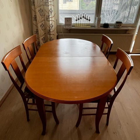 Pöytä ja tuolit on ostettu käytettynä, ja ollut meillä käytössä vuoden. Myydään muuton alta pois. Pöytä on täyspuuta, koristellut jalat (kuva). Lyhyt sivu 104 cm, päästä päähän 149 cm. Jatkopalaa ei pöytään tullut sen ostaessamme. Tuolit ovat kahta eri mallia (kts kuvat) - 2 vaalealla istuimella ja 4 tummalla. Käytön ja ajan jälkiä löytyy kaikista, mutta siisti kunto.