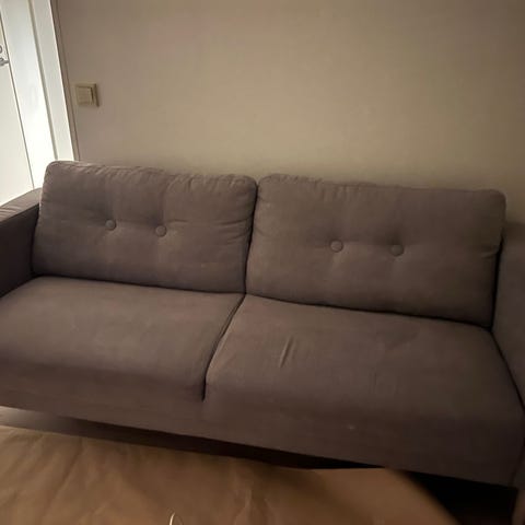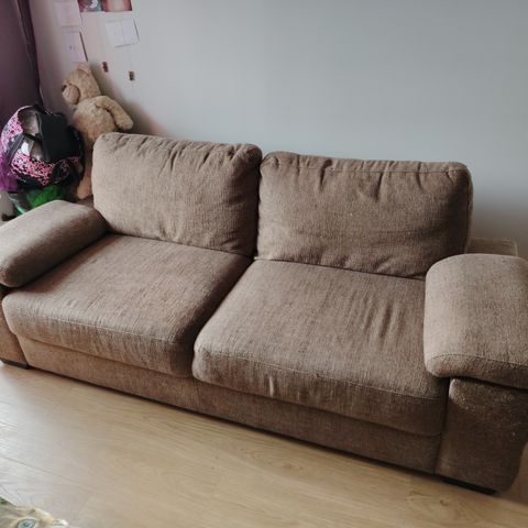 Myydään ryhdikäs sohva, jossa lapset pomppineet. Istuinosa kiinteä, pesty pesurilla mutta viimeisin pesu jää ostajalle. Kissatalous ja kissa raapinut oikeaa alanurkkaa (kuva). Selkätyynyt irrotettavat. Loimaalla, nouto