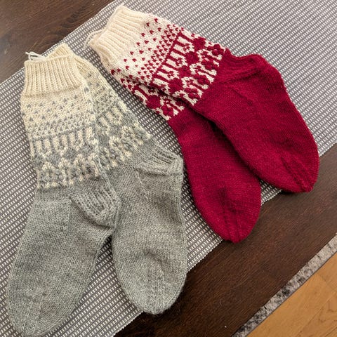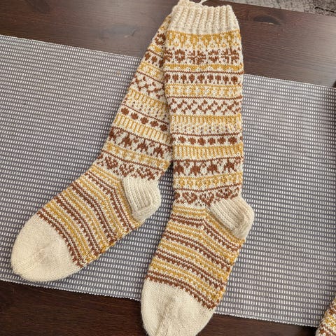 7 veljestä langasta käsin neulotut vihreät pohjemittaiset palmikkoneulesukat, koko 40-41. Kärjestä kantapäähän 26 cm, kantapohjasta varteen n. 36 cm. Mallissa kapea pohje