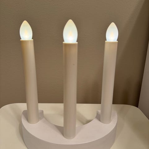 Vanha mutta toimiva kynttelikkö (ks. paketin kyljessä kuva). Aikoinaan Ikeasta ostettu, mutta ei enää myynnissä. Paketista löytyy kaikki osat ohjekirjaa myöten. Jalkaosa puuta tai vastaavaa, jalkaosaan tökätään pystyyn metallitikut, joihin valonauha ripustetaan. Menee pieneen tilaan joten helppo säilyttää.