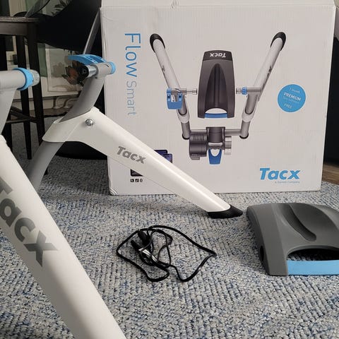 Comes with unopened Zwift Click (v2), thru axle adaptor, quick release axle, Allen key, spacer for chainset (not needed with Zwift Cog), disc brake stopper, power supply etc.