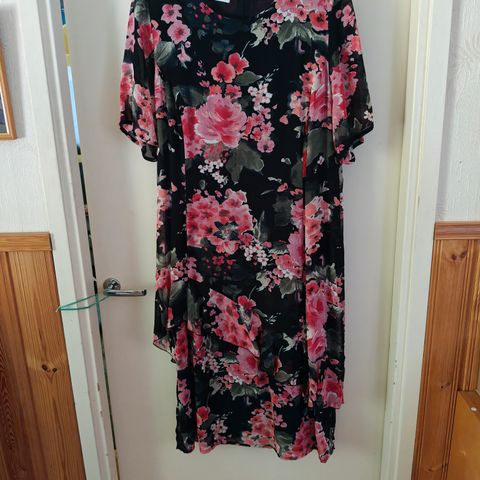Musta kotelomekko, päällä kiinteä, kukallinen sifonkiliehuke.