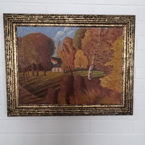 Metsäinen maisema voimakkaasti solisevalla purolla. Taiteilijasta en saanut selvää. Koko 79x129,5 cm.