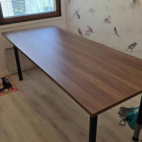 Myytävänä jykevä kirjoituspöytä ja kuvissa näkyvä samaa sarjaa oleva tuoli. Yhden vetolaatikon alalaidassa pieni kolhu. Muuten pöytä ja tuoli ovat hyvässä kunnossa. Pöytä tällä hetkellä purettu. Lemmikkitalous.