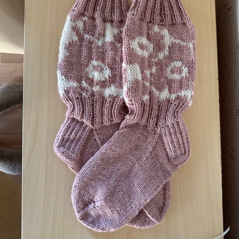 Kauniit sukat, käsinneulottu 7 veljestä-langasta.