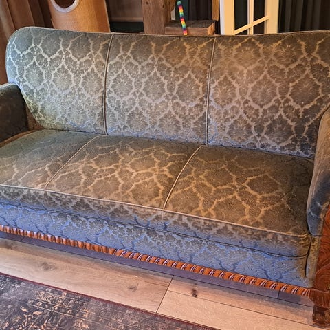Antiikkinen puinen sohva ja nojatuolit vaaleanpunaisella verhoilulla