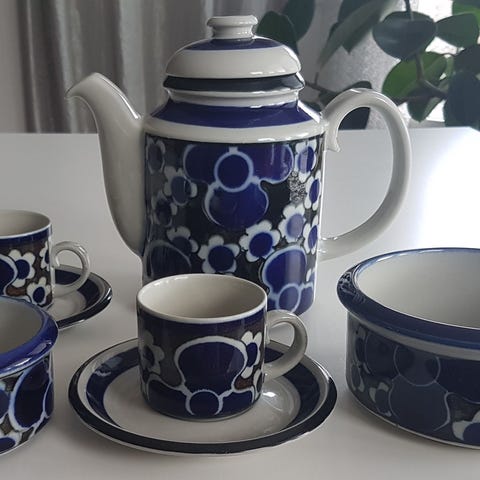 Arabia Saara kahvikuppi, asetti ja pullalautanen setti, jossa on kukkakuviointi. Setti sisältää kahvikuppeja ja lautasia, jotka on valmistettu keraamisesta materiaalista. Sopii kahvin ja teen tarjoiluun.