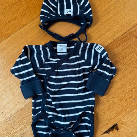 POPin tummansininen kauluspaitabody 50 cm (100 % puuvilla) ja tummansiniset merinovillasukkahousut 50-56 cm (80 % merinovilla, 17 % polyamidi ja 3 % elastaani). Käytettyjä, mutta ehjät ja siistit. Merinosukkahousut ovat keränneet irtonaista tekstiilinukkaa pesusta, mutta lähtee luultavasti tarraharjalla. Itse en valitettavasti sellaista omista.