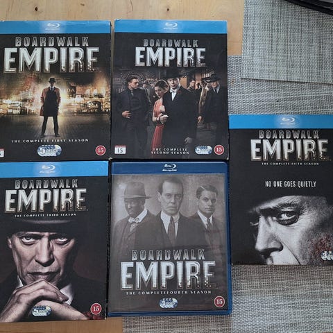Myynnissä Boardwalk Empire sarjan kaudet 1-5 blu-ray levyillä. Ensimmäisen kauden boxista pidikkeet sisällä poikki. Neljäs ja viides kausi vielä muoveissa