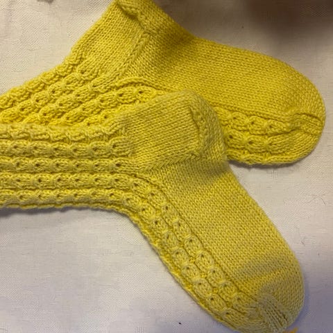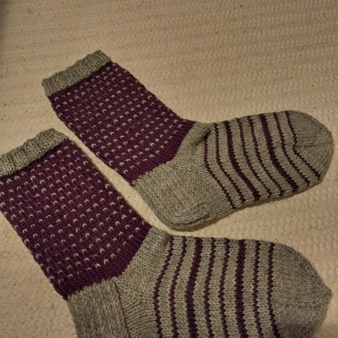 Kauniit sukat, käsinneulottu 7 veljestä-langasta.