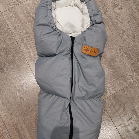Nordlys Untuvapussi jatkopalalla. Väri Grey Melange. Pussin takana aukot valjaille. Pieni tyyny pään alla.