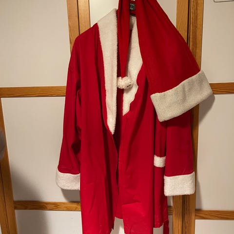 Muutaman kerran kotioloissa käytetty joulupukin asu. Asukokonaisuuteen kuuluu kuvassa näkyvät kaapu, vyö, saappaan suojat, hiukset, parta ja lakki. (Silmälasit eivät kuulu kauppaan.) Kokomerkintä L, mutta vatsalle on tilaa reilusti. Ohv uutena 60€, ostettu naamiaisasuliikkeestä. Hyvässä kunnossa. Koiratalous.