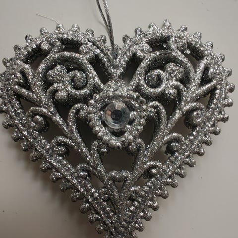 Kaksi metallista sydänkoristetta hopeanvärisenä, joissa koristeellinen kuviointi ja ripustusnaru. Sopii sisustukseen eri vuodenaikoina.