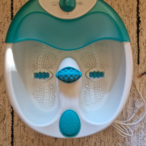 jalkakylpy, jossa hierontatoiminto ja lämmitin. Väri harmaa ja sininen. Sähkötoiminen laite jalkojen rentouttamiseen ja hoitoon.