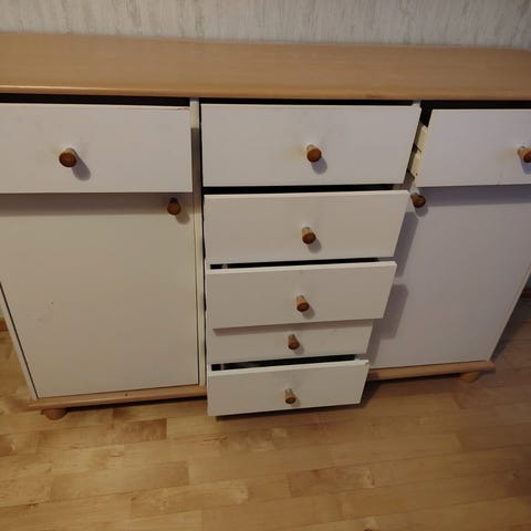 Hyvässä/kohtalaisessa kunnossa oleva ehjä lipasto. Myynnissä myös samaa sarjaa oleva isompi lipasto.