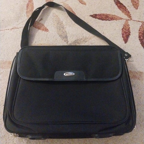 Samsonite läppärilaukku kokoa 30 cm x 40 cm. Laukussa on puna-harmaa kangaspinta, säädettävä olkahihna sekä useita taskuja ja vetoketjullisia osioita. Kunto erittäin hyvä, laukun etuosassa hieman jälkiä mustekynästä (näkyy kuvassa).