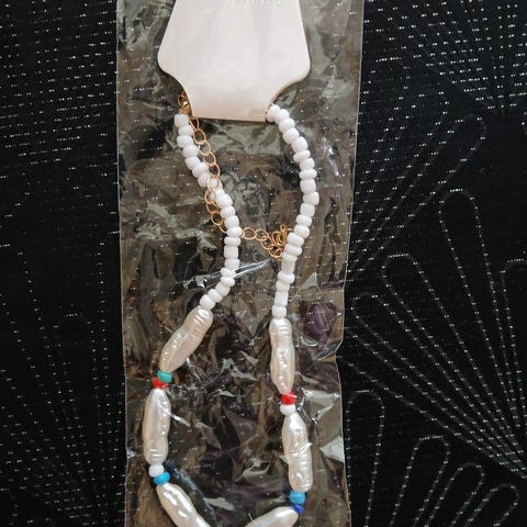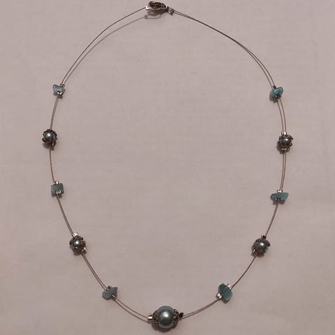 Itse tehty vaalean vihreä kaulakoru, joka on ollut muutaman kerran käytössä ja puhdistettu. Koru on erittäin hyvässä kunnossa. Materiaalit ovat ruostumaton 0,7 mm paksu metallilanka, pienet litistettävät metallihelmet, rapulukko ja pieni metallirengas sekä lasisia eri kokoisia helmiä. Korun pituus 45 cm. Keskimmäisen helmen pituus on 2,2 cm, leveys 1,7 cm ja paksuus 0,7 cm.