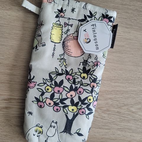 Finlayson Juhlamuumi -sarjan patakinnas (pituus noin 30cm) ja 2 kpl patalappuja (koko noin 21x21cm). Juhlamuumi-kuosi oli vuoden 2014 kuosi, joka juhlisti 100. vuotta Tove Janssonin syntymästä. Sitä ei ole siis ollut saatavilla enää vuosiin. Tuotteet ovat käyttämättömät ja niissä on vielä alkuperäiset laput tallella. Sopii hyvin esimerkiksi lahjaksi.
