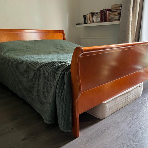 Myydään 160 cm leveä parisänky, jonka päädyssä on valo. Sängyssä on vaneripohja, joka on toisessa kuvassa nostettu pois, jotta sängyn alarakenne näkyy. Sänky on jämäkkä eikä natise.
