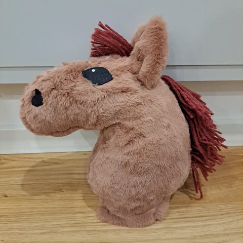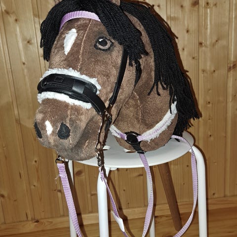 Täysin käyttämätön uusi keppari. Kerkiää vielä esimerkiksi joululahjaksi. Tehty fleecestä, jonka sisäpuolelle on silitetty tukikangas estämään kankaan venymisen ja hepan muotojen muuttumisen. Harja puuvillalankaa. Tehty alusta loppuun käsityönä ja myös ommeltu käsin.