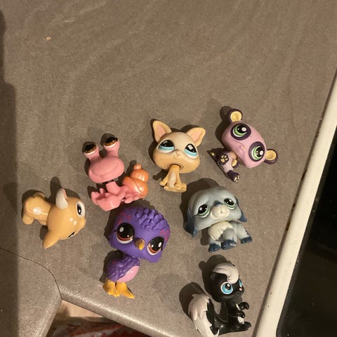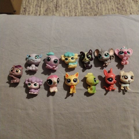 Littlest Pet Shop lelusetti, useita pieniä eläinhahmoja eri väreissä ja muodoissa, muovimateriaalia.