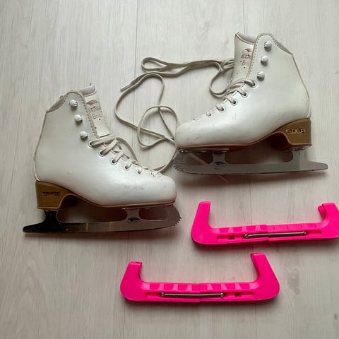Käytettynä ostetut ja yhden vuoden hallikäytössä olleet. Hyvät luistimet taitoluistelijalle vaikka ulkojäille. Ulkoasussa jälkiä. Koko edea 205