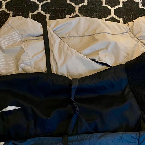 Dog It Lifen valmistama softshelltakki, tehty koiralle joka käyttää koon 65 takkeja. Selässä vetoketju, lahkeissa kuminauhoille kujat (nyt ei nauhoja). Lahkeissa merinovillavuori. Toisesta helmasta paikattu kaksi repeämää. Mitat: rinnanympärys hihojen takaa noin 84 cm ja kaula-aukon ympärys noin 56 cm venytettynä (tässä säätö kuminauhalla).