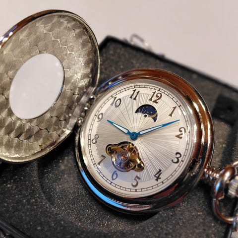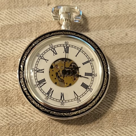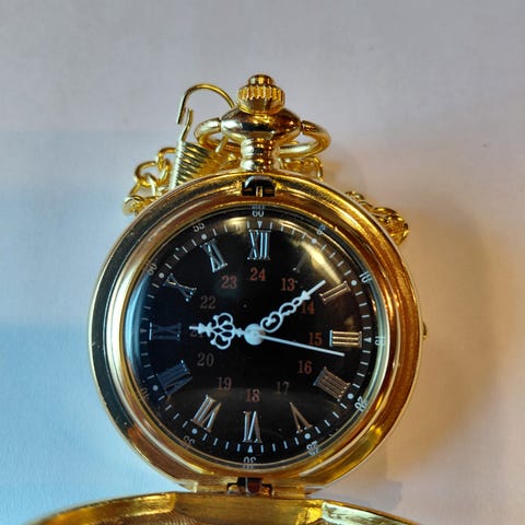 Käyttämätön taskukello, vedettävä, ketjulla, 52mm, koneisto näkyy edestä ja takaa..TORIDIILI, Jouluksi kotiin..