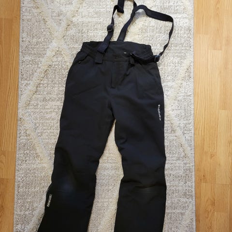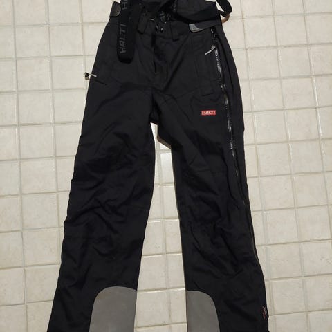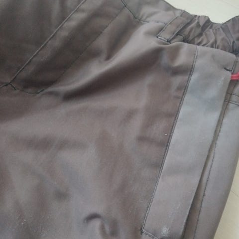 Drymaxx, vedenpitävät mutta hengittävät toppahousut. Väljä malli, lahkeensuut raahautuneet rikki. Polvet ja takamus ehjät, mutta värissä kulumaa.