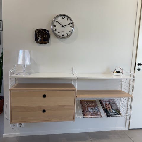 Design hylly mustat metalli sivut, ruskeilla tammi hyllyillä.