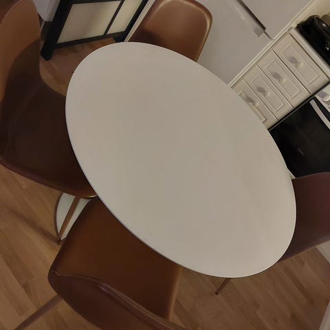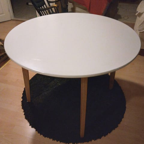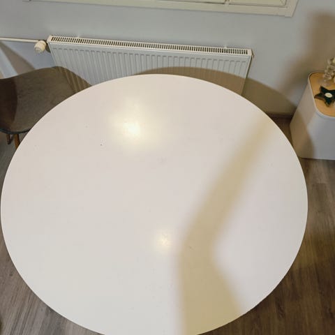 Muuton tieltä pöytä seuraavalle käytettäväksi! Pöydän pinnassa pyöreitä pinttyneitä tummempia kohtia, jaloissa ja reunoissa kulumaa. Jatkettava, mutta jatkopala puuttuu, näppärä taiteilee uuden. Jatkopalan mitat 82cm x 110cm x 1,9cm.