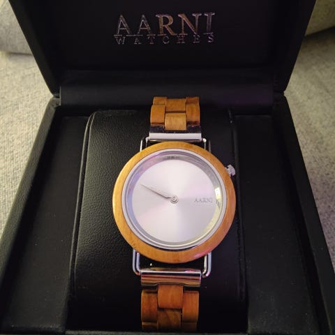 Aarni rannekello, mukana alkuperäinen pakkaus, lisäosat ja takuutodistus. Kellossa on puinen ranneke ja minimalistinen design. Tästä vielä hyvin pukinkonttiin.