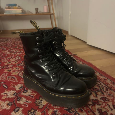 Korkealle kohoavat Jadon-maiharit on valmistettu vegaanisesta Kemble PU -materiaalista. Nauhat sointuvat mallin mattapintaiseen viimeistelyyn ja kontrastoivaan reunaan. Mallissa on 2,5 cm paksu pohja, keltainen pohjatikkaus ja kirjailtu kantapäälenkki. Ei laisinkaan eläinperäisiä tuotteita. Täynnä DM's-asennetta.