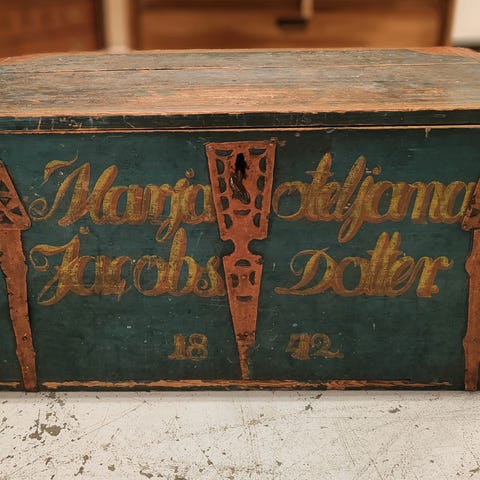 Kookas ja komia kirstu. Vuosiluku 1887. Metalliosissa paikoin patinaa. Hieno kansiosan lisäpiilo vanhalla koukkusalvalla. Kansi pysyy auki myös ilman kuvien tukikapulaa oikealla puolella olevan metallisalvan varassa. Leveys 99cm (kansi). Korkeus 61 kaaren yläreunaan. Sisäsyvyys n 44. Pitsikotelo reunassa n 14x55 12 cm syvyys. Sivusta leveys alaosassa n 51 ja yläosassa n 61 cm. Hyvä ja ryhdikäs arkku on palvellut viimeiset n 50v verhojen ym sisustustekstiilien säilönä. Luovutetaan tyhjänä ja imuroituna hakijalle. Nouto Riihimäki sop muk.