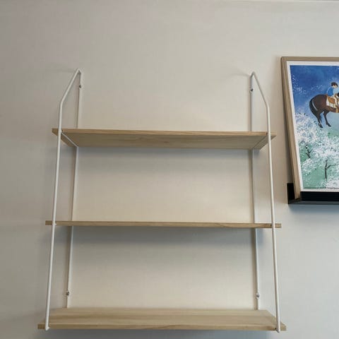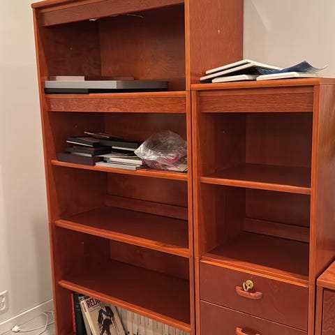 Kalustetehtaan tekemä hyllykkö. Pyörillä. Umpitausta. Säätöhyllyt.