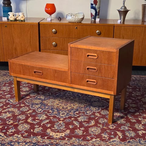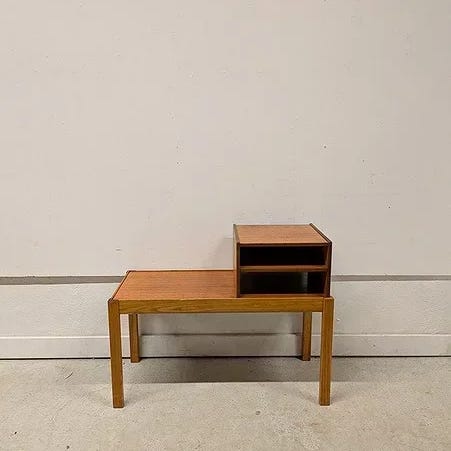 Erittäin siisti vanha pieni teak lipasto / puhelinpenkki. Istuintasossakaan ei kulumisen merkkejä. Teak, tiikki.