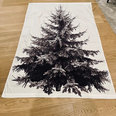 Valkoinen verho jossa joulukuusipainatus. Tankokuja. 230x140cm.